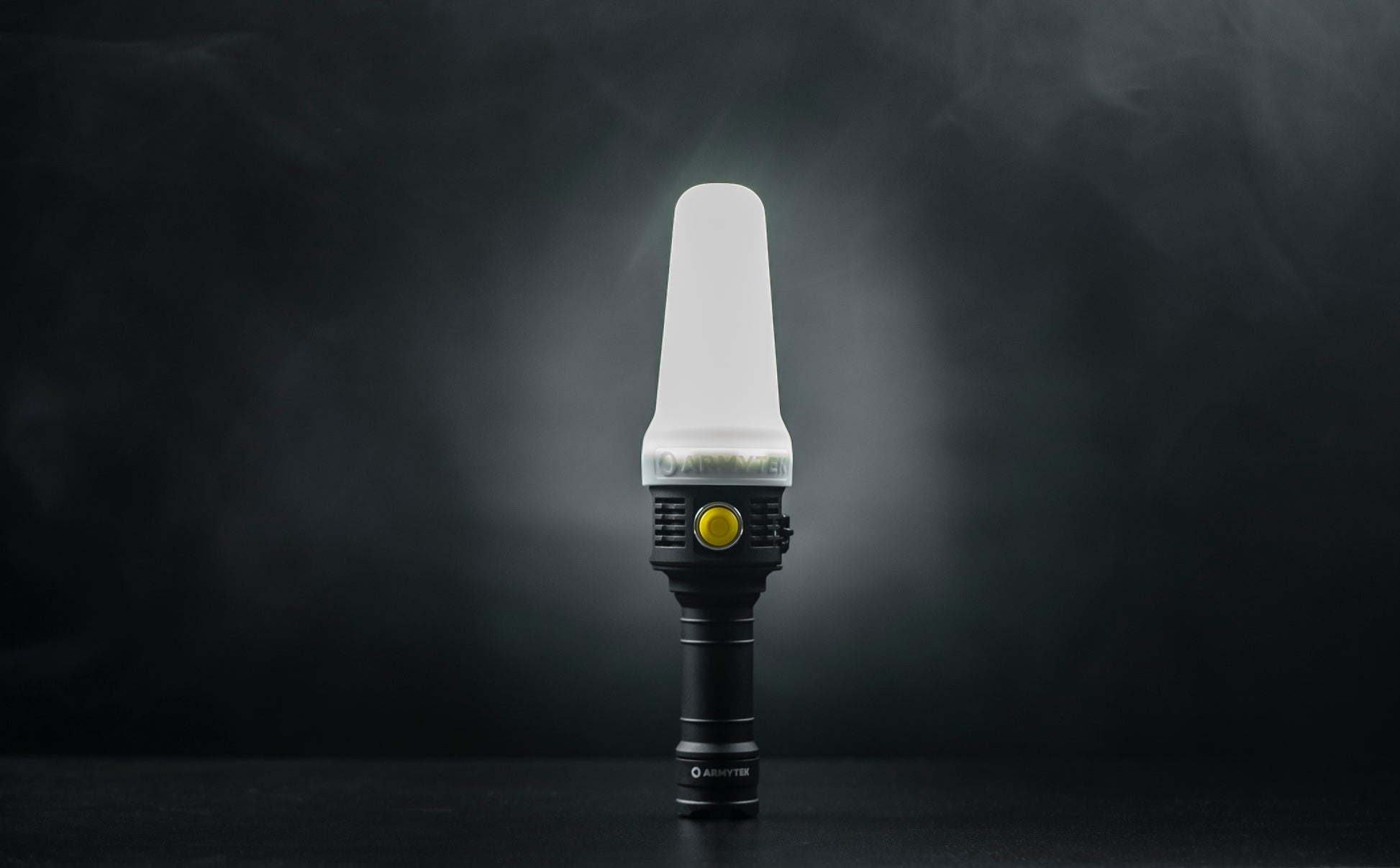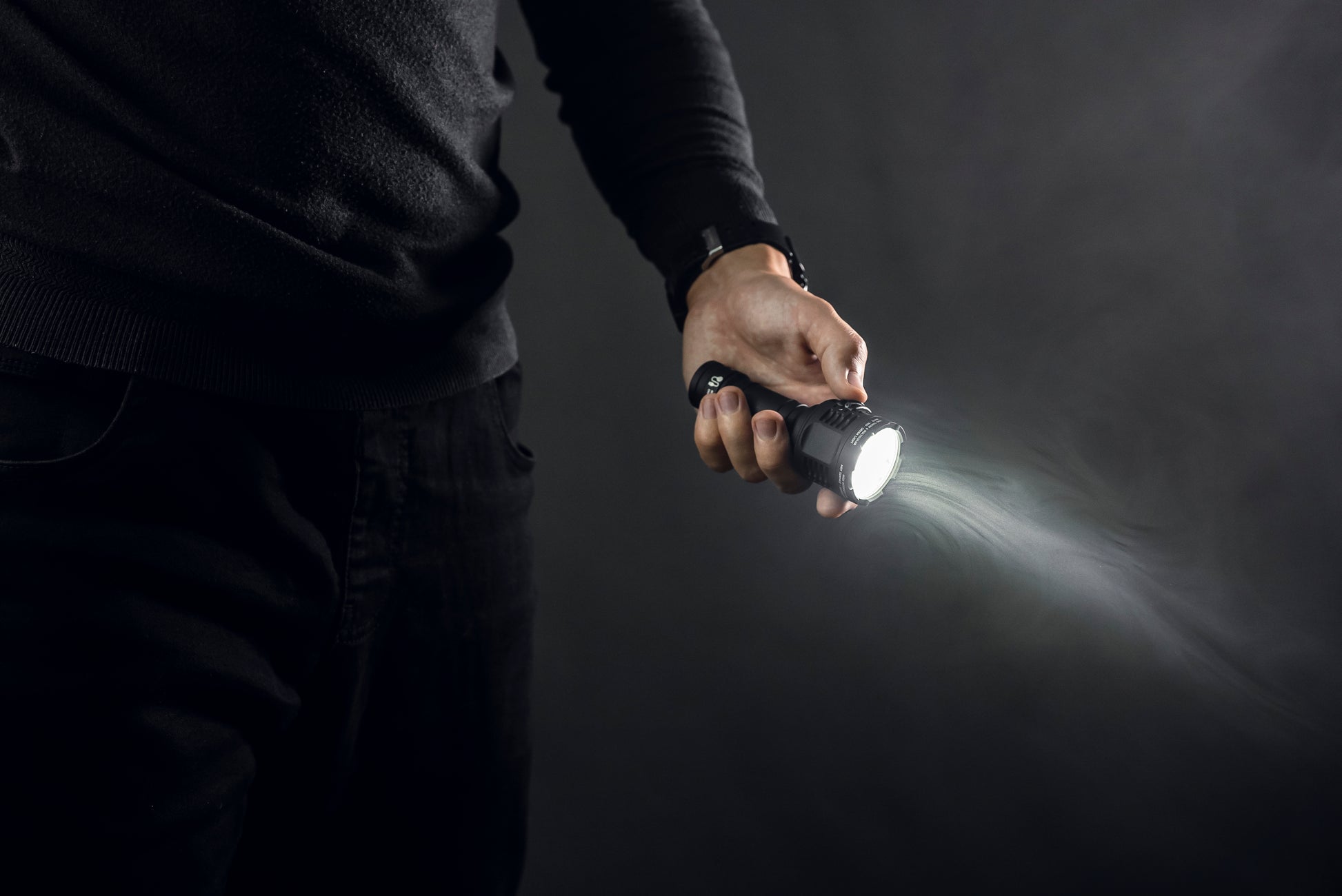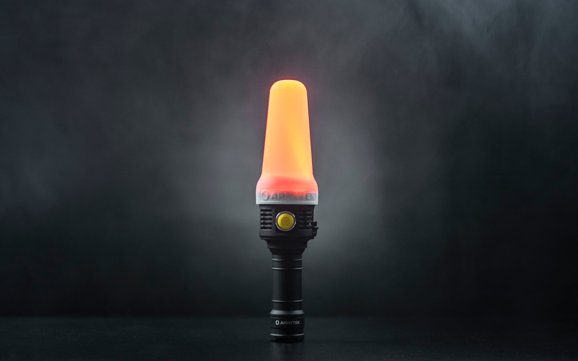 Une lampe de signalisation : différents modes de luminosité et mode Balise avec lumière blanche, rouge et verte. Le cône en silicone blanc inclus permet l'émission d'un faisceau omnidirectionnel pour signaler, réguler la circulation ou indiquer le lieu d'un accident.
