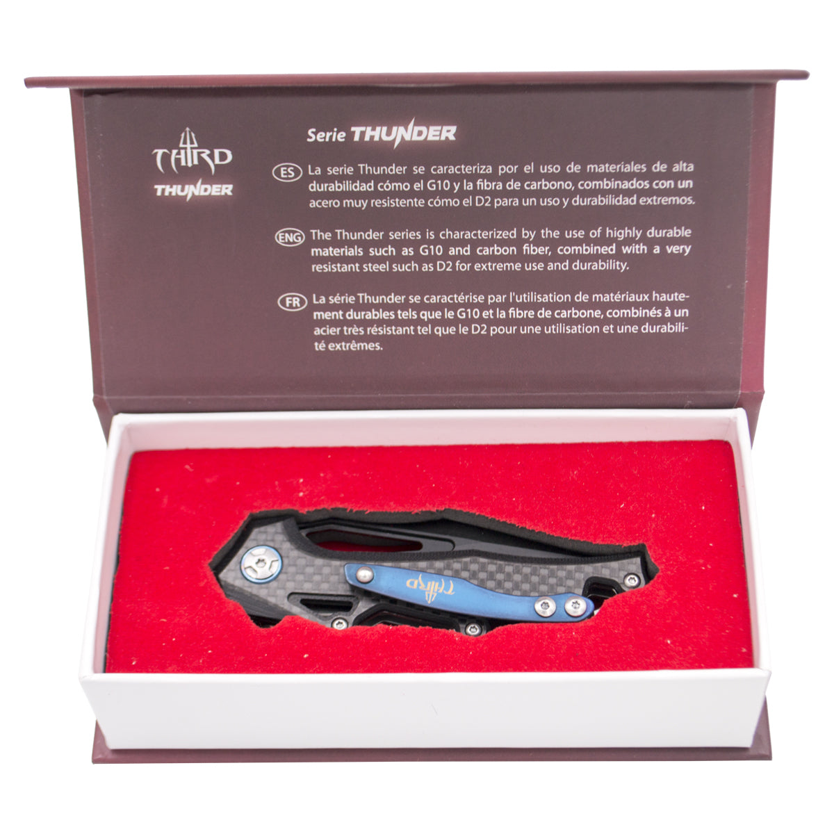 Couteau assisté Third K4110, Thunder Series, couteau avec manche en fibre de carbone et G10 en noir. Lame en acier D2 de 7,7 cm avec finition noire. Système d’ouverture “Ball Bearing”