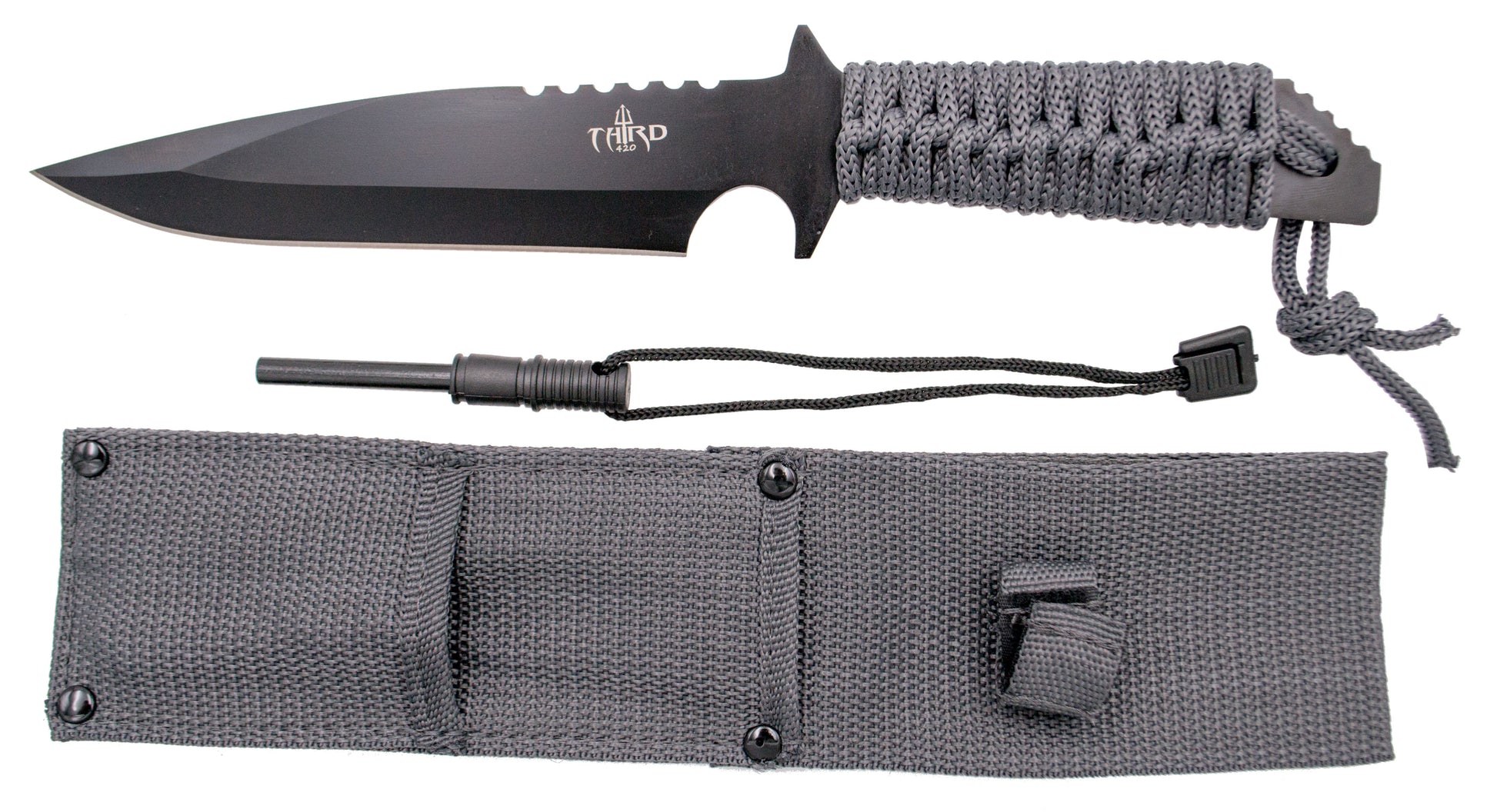 Couteau outdoor Third H0401 avec lame de acier de 17,5 cm finition noire, manche cordé gris, avec étui de nylon gris et silex.