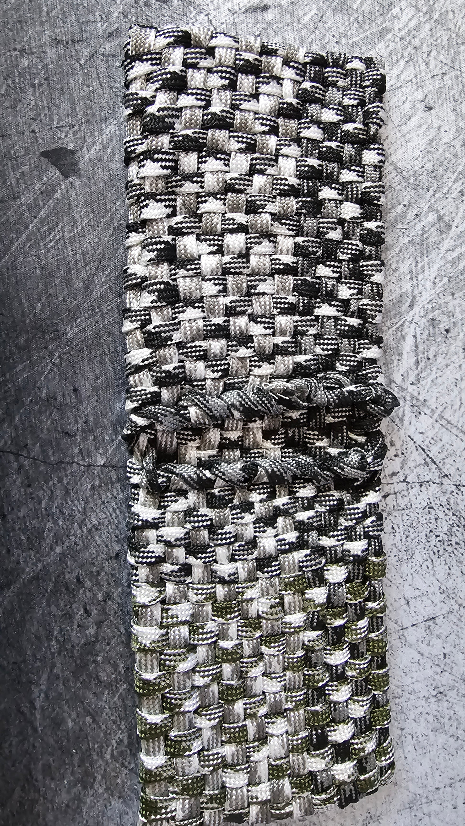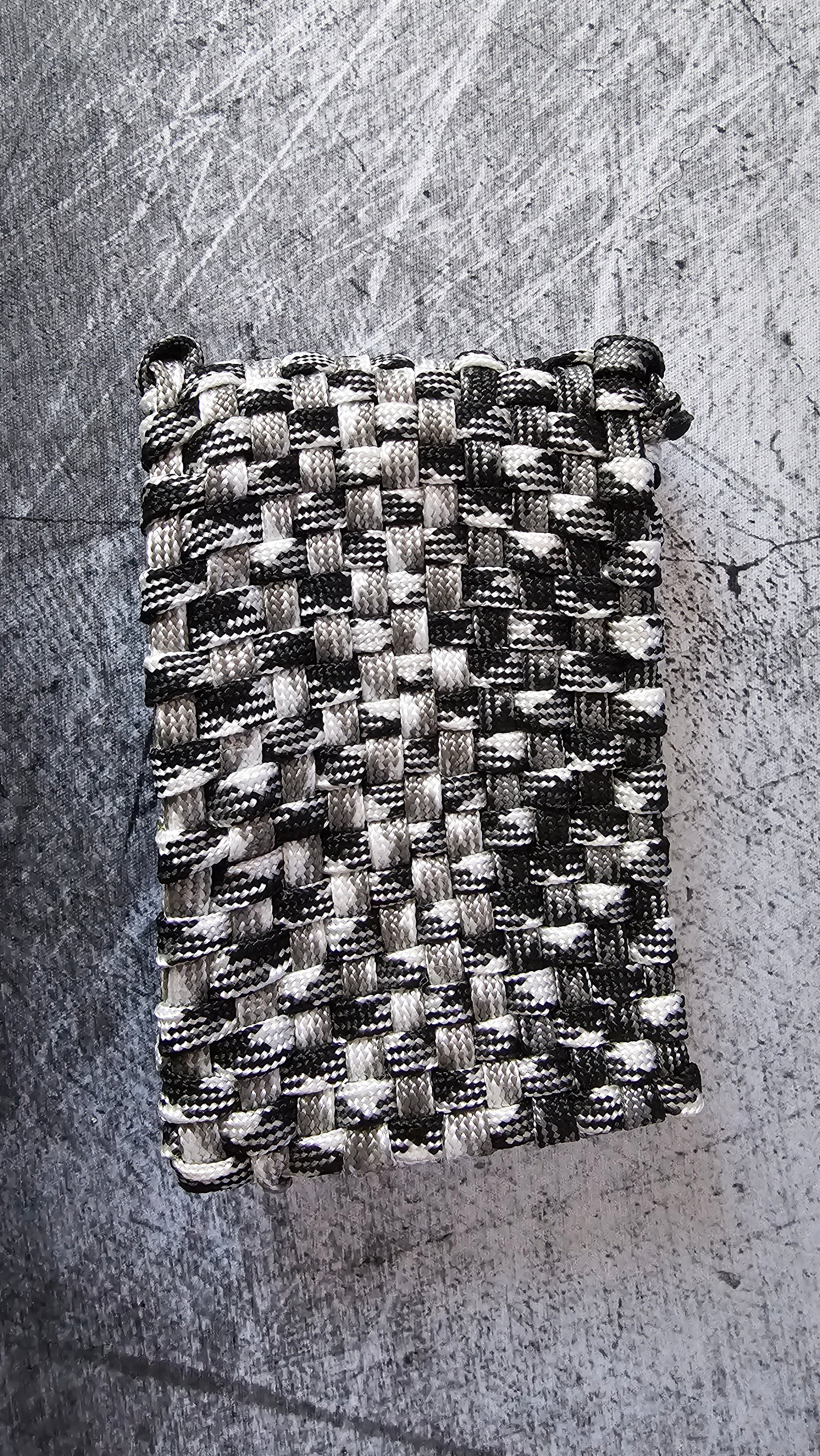 Ce porte-carte est tissé à partir de cordons en type paracorde, avec un mélange de tons noir, blanc et kaki, pour un effet camouflage urbain très tendance. Son tressage à plat lui donne une texture agréable et une tenue solide.