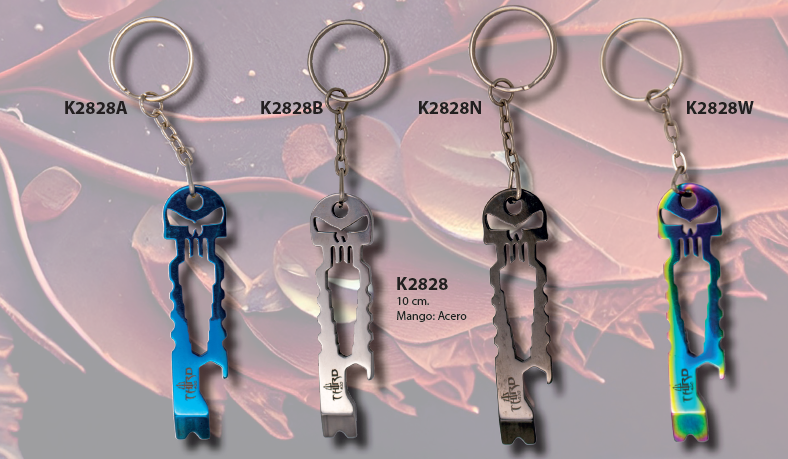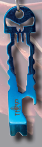 Porte-clés polyvalent Third. Acier inoxydable de 7,5 cm avec finition bleue, peut être utilisé comme taille-crayon, décapsuleur et clé.