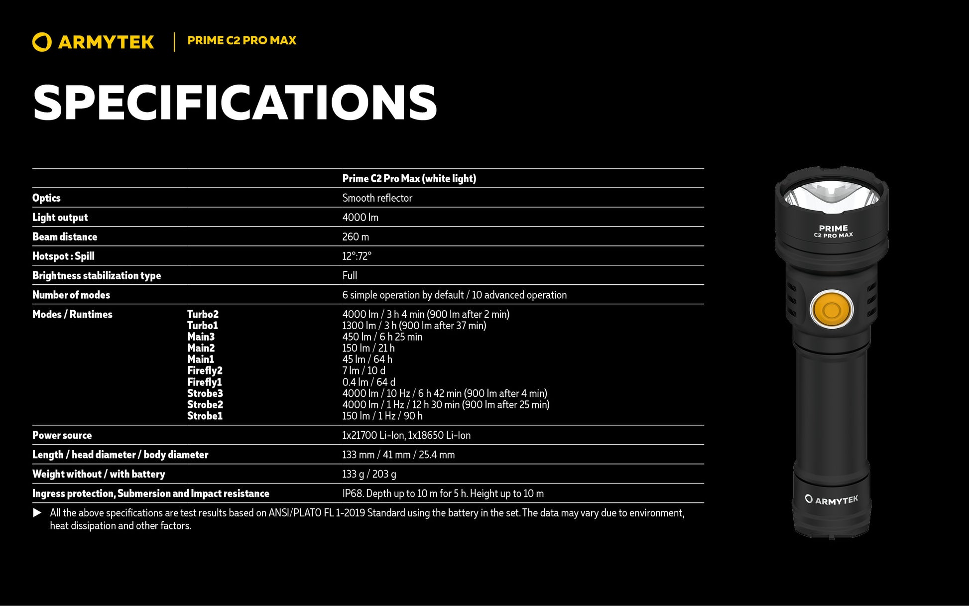 4000 Lumens ANSI (3h04) portée 260 mètres (Turbo 2) (900 Lumens après 2 minutes)