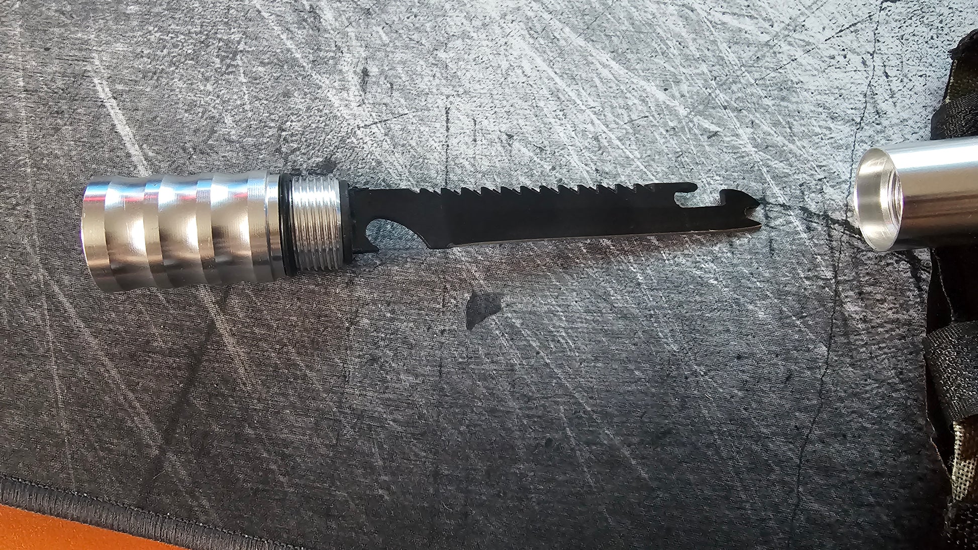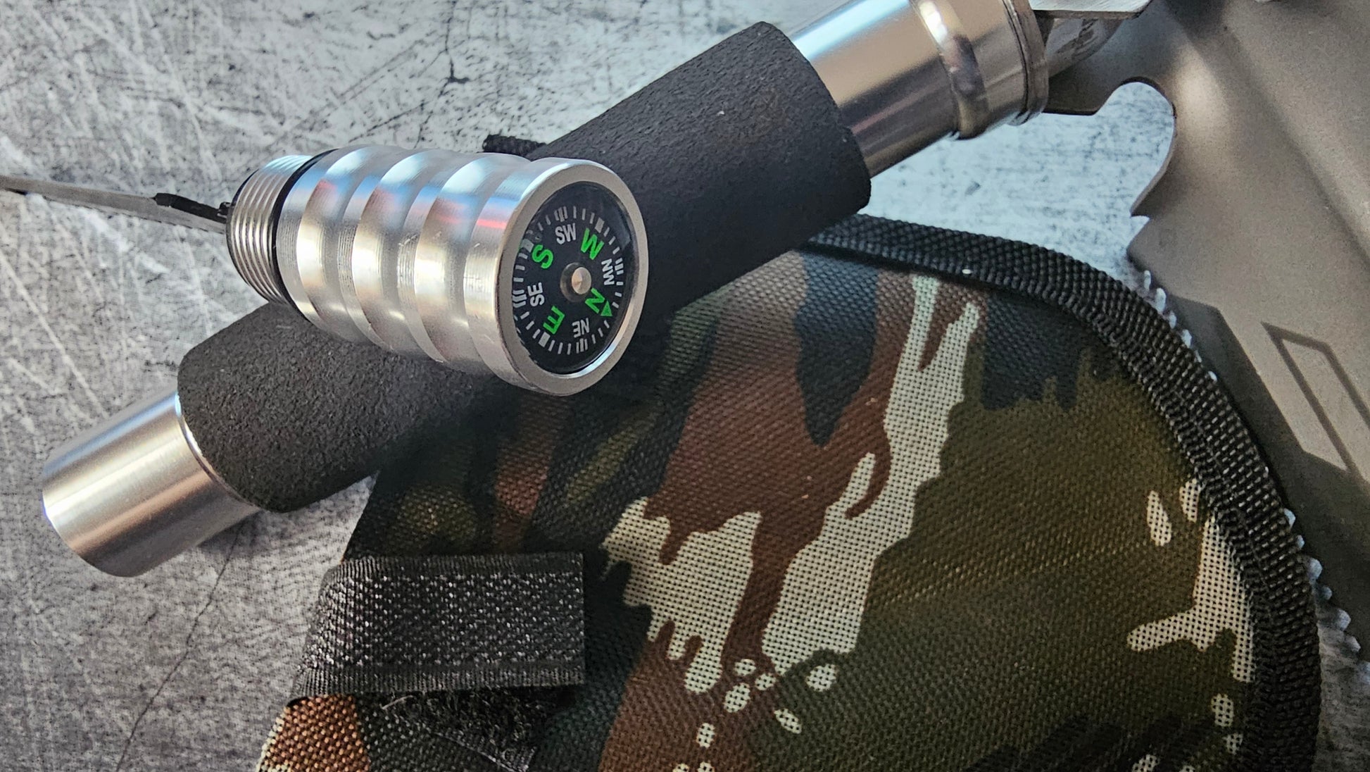 Son **manche en aluminium** de 18,5 cm est léger mais ultra solide, et intègre une **boussole intégrée** pour l’orientation en pleine nature.